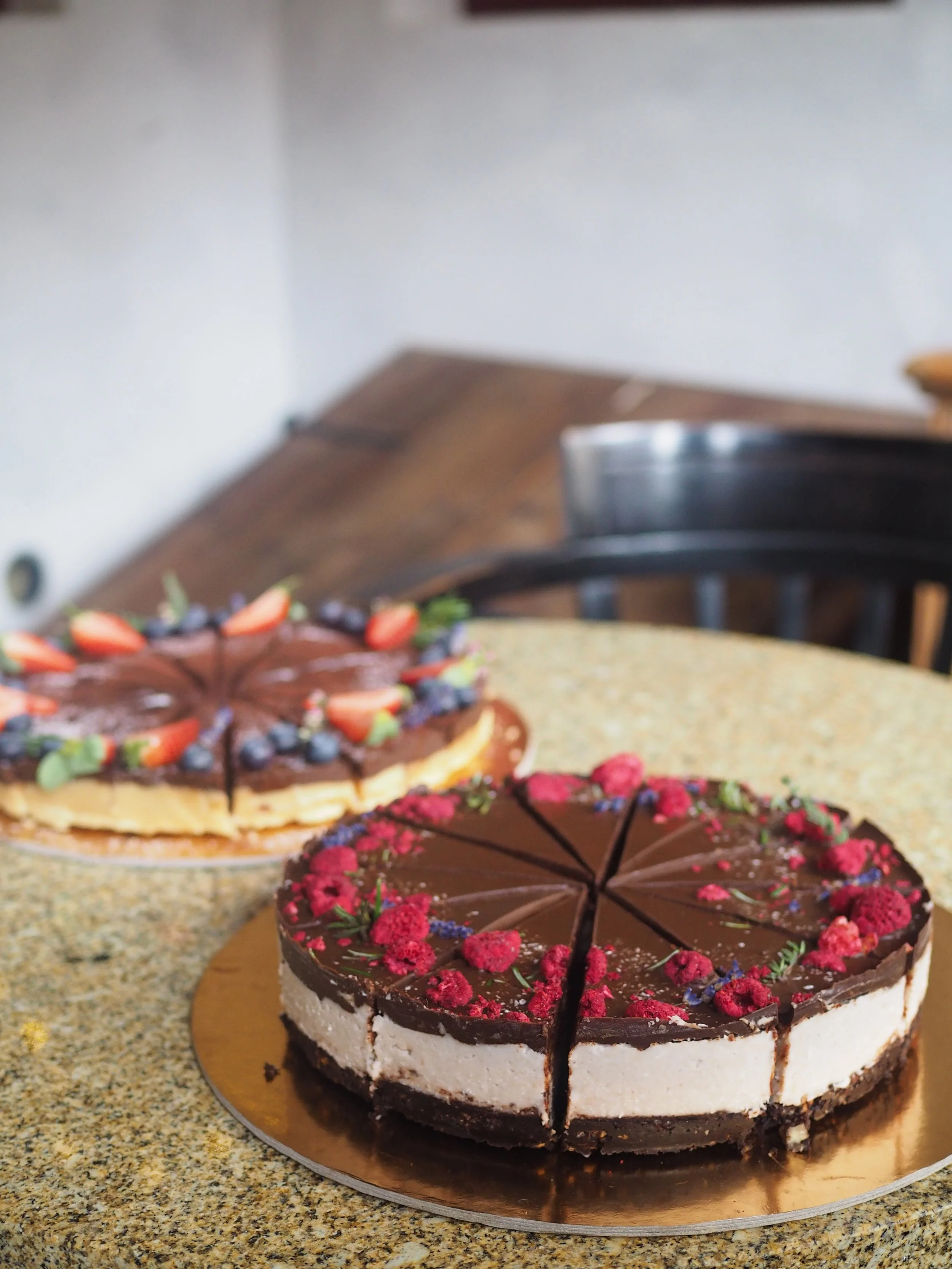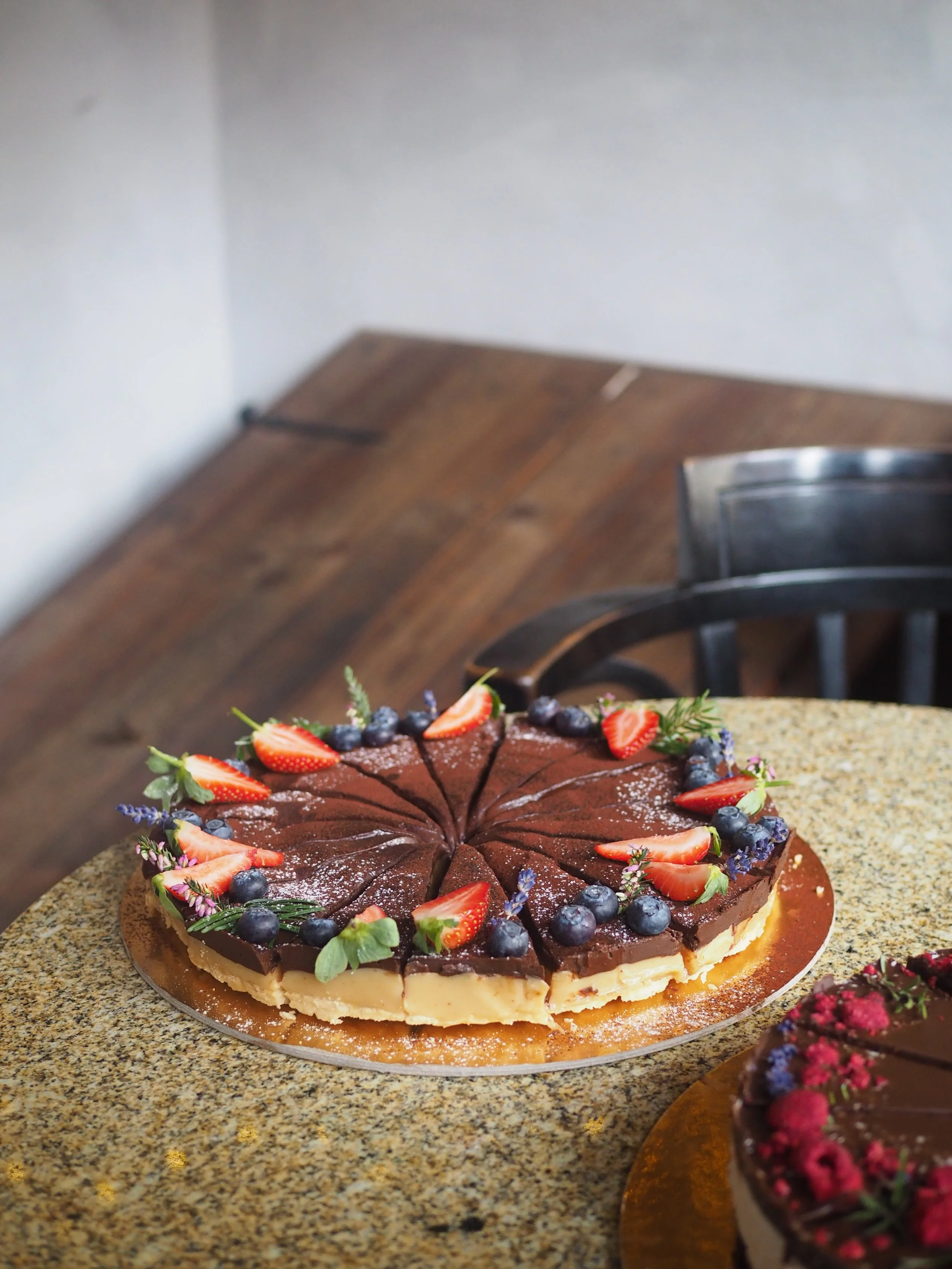 chocolate sponge + strawberry coulis + vanilla mascarpone filling + dark chocolate ganache frosting + strawberries