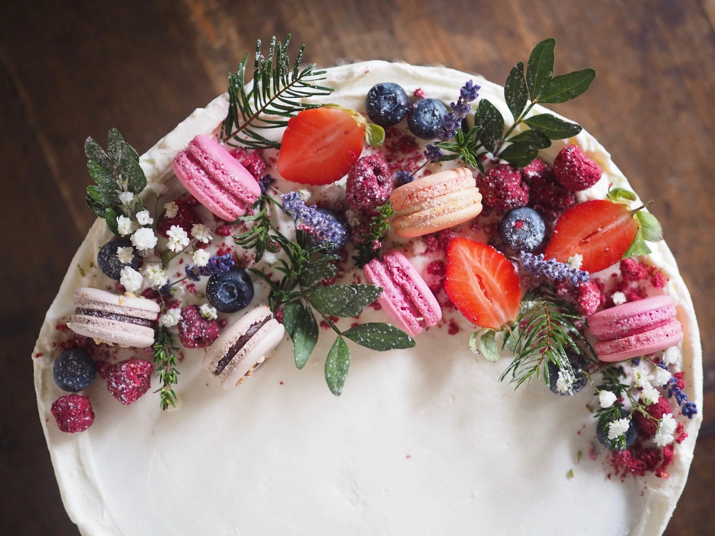 vanilla sponge + berries coulis + vanilla mascarpone filling + white chocolate ganache frosting